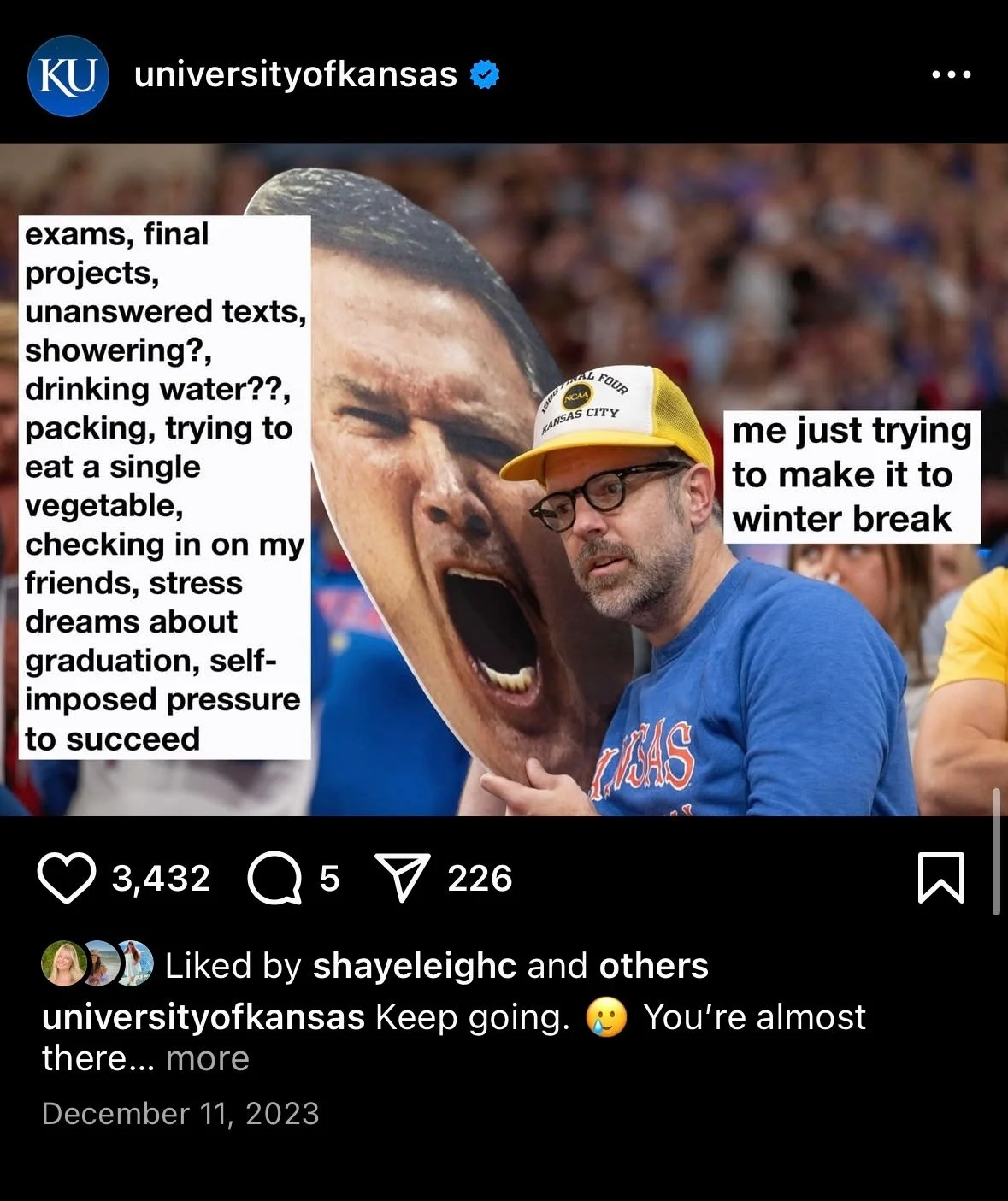 During my three years as a Social Media Assistant at the University of Kansas, I played a key role in elevating the university’s digital presence and student engagement efforts. I led the creation of RFPs and developed strategic content campaigns tailored to audience insights. I collaborated closely with Kansas Athletics and Big 12 partners on campus events, driving both in-person attendance and online engagement. Additionally, I managed the university’s digital brand voice across platforms like Instagram, X (formerly Twitter), Facebook, and TikTok, using Sprout Social to monitor performance and optimize content strategies. A highlight of my role was spearheading the full rebrand and relaunch of the university’s TikTok channel, which significantly boosted student engagement and brand relevance on emerging platforms.